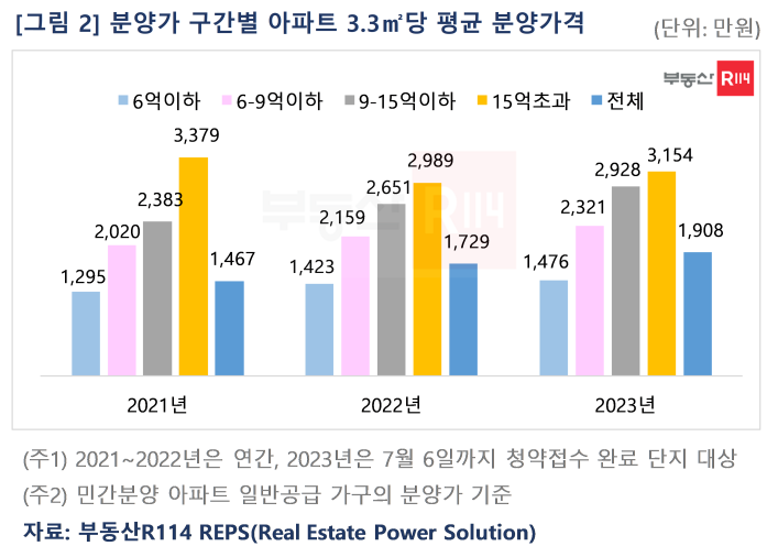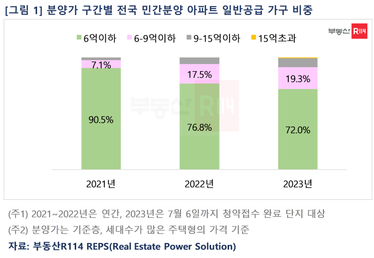 부동산R114에 따르면 올해 1월부터 7월 6일까지 청약접수가 완료된 민간분양 아파트의 일반공급 물량은 3만3,925가구로 조사됐다. 분양가 구간별로 6억원 이하 2만4,412가구(72.0%) 6억원 초과 9억원 이하 6,560가구(19.3%) 9억원 초과 15억원 이하 2,666가구(7.9%) 15억원 초과 287가구(0.8%) 순이다. 6억원 이하 아파트 가구 비중은 분양가상한제 등 고분양가 규제가 시행된 2021년 90.5%를 기록한 후, 2022년 76.8%, 2023년 72.0%로 낮아졌다. 반면 6억원 초과한 가격 구간대의 비중은 커졌다. 고금리, 고물가, 공사비 인상과 함께 연초 전방위적 규제 완화로 사업주체의 가격 책정에 운신의 폭이 넓어진 것이 분양가 상승을 견인한 원인으로 판단된다.