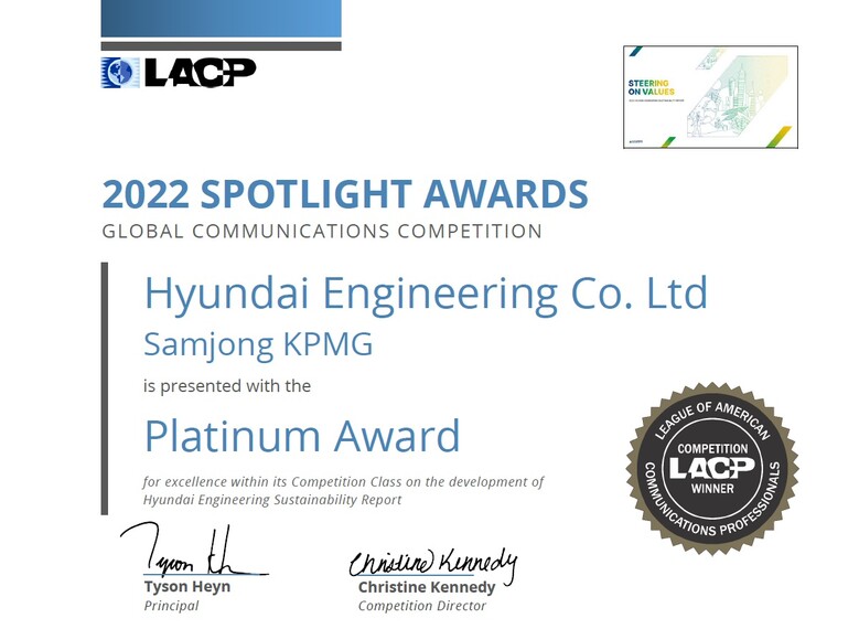 현대엔지니어링은 LACP 주관 '스포트라이트 어워드'에서 지난해 이어 2년 연속 대상을 수상해 지속가능경영에 대한 대외 커뮤니케이션 성과와 노력을 세계적으로 인정받았다.