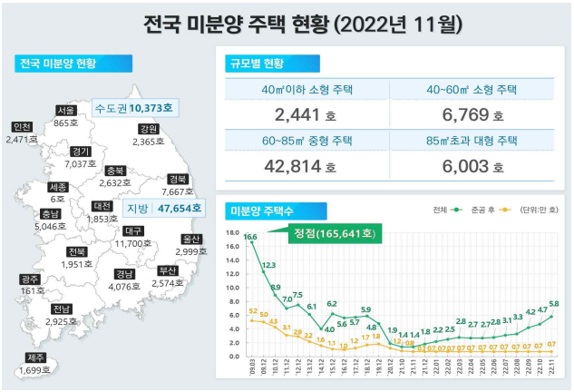 지역별로 수도권 미분양이 1만373호로 한 달새 36.3%(2761호) 늘었고, 지방 미분양은 4만7654호로 20.3%(8천49호) 증가했다. 면적 85㎡를 초과한 중대형 미분양은 6003호로 26.5%, 85㎡ 이하는 5만2024호로 22.5% 증가했다.