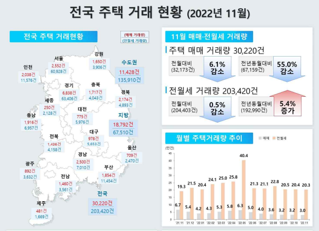 11월 한 달 기준으로도 전국 주택 매매거래량(신고일 기준)은 총 3만220건으로 전년 동월(6만7159건) 대비 55% 감소했다. 이는 10월보다(3만2173건)보다도 6.1% 줄어든 수준이다.
