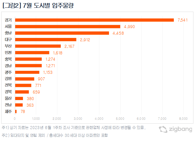 권역별로는 수도권이 1만 4,149세대, 지방이 1만 6,393세대 입주하며 지방 입주물량 비중(54%)이 조금 더 높다. 수도권은 서울에서 4,990세대가 입주하며 많은 물량이 공급될 예정이다. 광진구, 은평구, 동대문구에서 총 4개 단지가 입주하며 이 중 3개 단지는 1,000세대 이상의 대규모 단지다. 경기는 7,541세대 입주하며 7월 지역별 입주물량중 가장 많은 물량이 입주한다. 전월 1만 여 세대가 입주했던 인천은 1,618세대만이 입주할 예정이다.