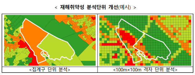 이번 개정안은 재해 취약성 분석 단위를 기존 인구통계조사 집계 구(인구 500명을 기준으로 도로 등 영구 지형물로 구획한 공간 단위)에서 100m×100m의 격자 단위로 변경해 공간적 정확도를 높였다.