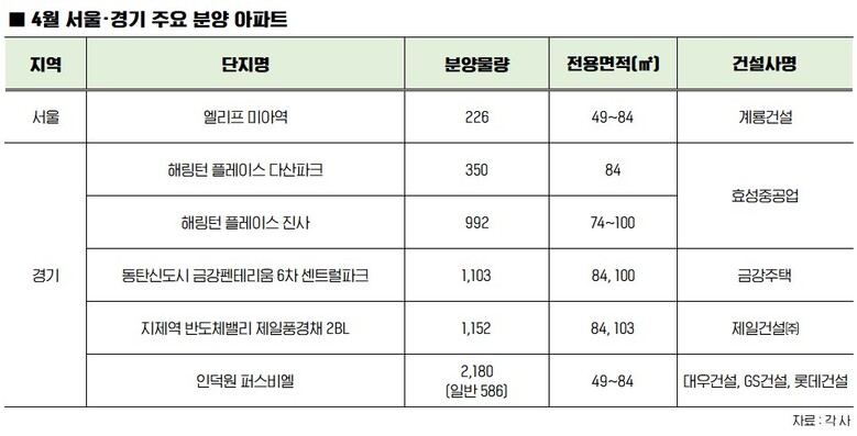 서울에서는 계룡건설의 '엘리프 미아역'이 분양 예정이다. 전용면적 49~84㎡, 226가구가 분양한다. 신세계건설의 빌리브 에이센트’도 4월 분양 예정으로 지하 5층~지상 24층, 전용 49~84㎡ 총 492세대/실 규모로 조성된다.
