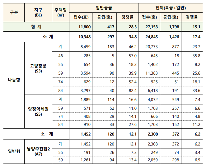 최종 유형별 경쟁률은 나눔형 17.4대 1, 일반형 6.2대 1을, 지역별로는 고양창릉이 23.7대 1, 양정역세권 7.4대 1, 남양주진접2 6.2대 1을 기록했다.