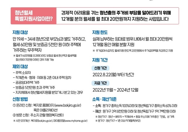 월세 지원 신청은 오는 22일부터 1년 동안 수시로 받는다. 지원을 희망하는 청년들은 복지로 누리집 또는 어플리케이션을 통하여 신청하거나 거주지의 행정복지센터에 방문 신청하면 된다.