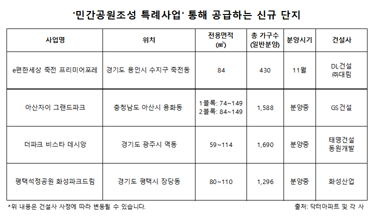 연내 민간공원 특례사업을 통해 분양하는 신규 단지는 다음과 같다.