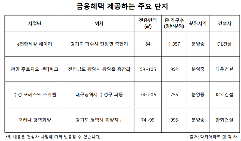 금융혜택을 제공하는 주요 분양 단지는 다음과 같다.