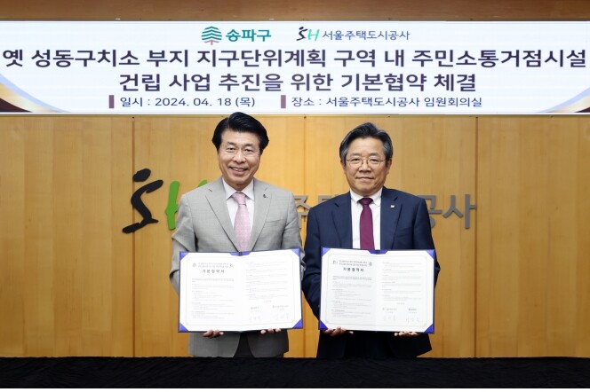 SH공사는 이를 위해 주민소통거점시설 설치와 제공을 위한 설계, 시공 등 전반적인 업무를 수행하고, 송파구청은 시설 기본계획 수립 및 인허가 업무행정지원을 진행할 계획이다. 또 올해 주민소통거점시설에 대한 설계공모를 진행하고 2027년 준공하는 것을 목표로 협력해나갈 예정이다.