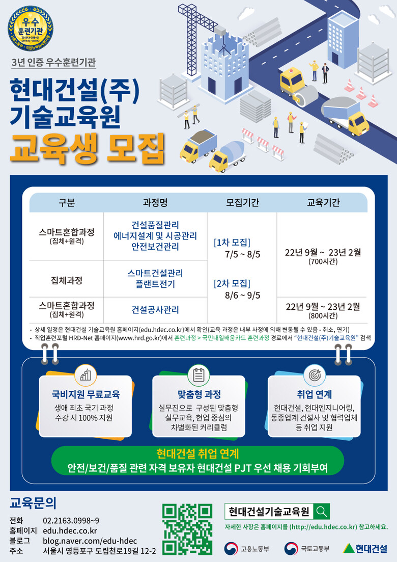 현대건설 기술교육원이 2022년 하반기 국가기간전략산업과정 교육생을 모집 중이다.