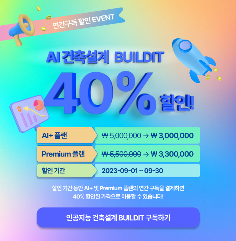 빌드잇의 서비스 플랜 중 인공지능 건축설계 기능을 사용할 수 있는 AI+, 프리미엄 플랜에 대해서 40% 할인된 가격으로 1년을 사용할 수 있다.