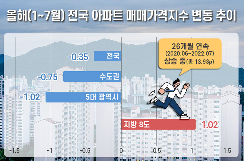 한국부동산원 아파트 매매가격지수 자료에 따르면, 지방 8도는 2020년 6월부터 올해 7월까지 26개월(총 13.93p)연속 상승한 것으로 나타났다. 특히 지방 8도는 올해 1~7월 총 1.02p 올랐다. 반면 동기간 전국은 0.35p, 수도권은 0.75p, 5대 광역시는 1.02p 하락했다.