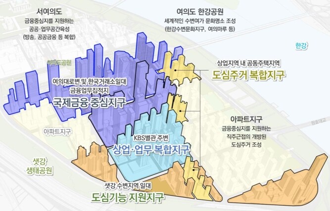 구체적으로 금융중심지 일대는 초고층 건축물이 들어설 수 있도록 기준높이 350m에서 완화가 가능하도록 하고, 한국거래소와 KBS별관 등 대규모 부지는 랜드마크 계획이 가능하도록 특별계획구역으로 지정했다.