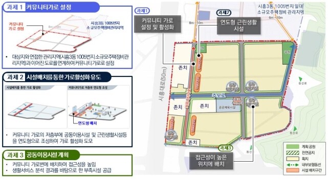 금천구 시흥3동 950번지 일대는 연접한 시흥3동 1005번지 일대 계획과 연계해 시흥대로12길을 기존 8m에서 10m로 확충하고 근린생활시설 등 가로활성화 시설을 배치했으며, 시흥대로18길은 지역 내 부족한 생활서비스 시설이 배치될 수 있도록 주 서비스도로를 설정해 공동이용시설과 공공체육시설을 배치했다.