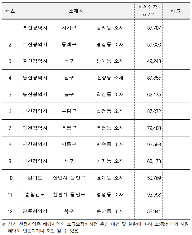 또한, 이번 지원 대상지역 중 지역주민 관심도 및 지자체 추진 의지 등을 종합적으로 고려하여, 관리지역 지정 가능성이 높은 지역은 집중지원 대상지역(약 1~2곳)으로 선정해 적극적인 지원을 이어나갈 계획이다.