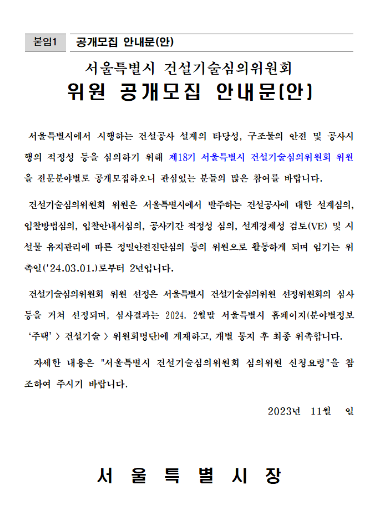 | ▲서울시 건설기술심의 위원 공개모집 안내문. 사진=서울시 제공 |