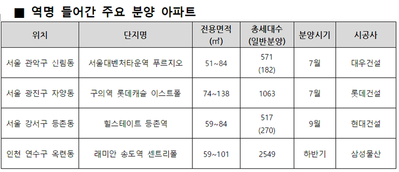 서울대벤처타운역 푸르지오, 구의역 롯데캐슬 이스트폴, 힐스테이트 등촌역, 래미안 송도역 센트리폴, 왕길역 로열파크씨티 푸르지오 등 하반기에 역세권 입지를 부각시킨 ‘역명’을 붙인 아파트가 대거 나온다.