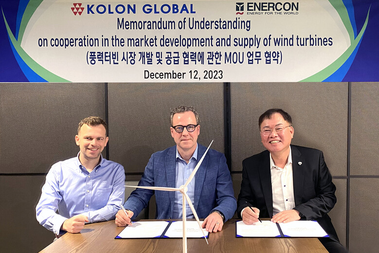 국내 풍력발전 점유율 1위인 코오롱글로벌이 지난 12일 과천 코오롱 타워에서 독일의 기어리스 직접구동형 풍력 터빈의 선도업체인 ‘에너콘’과 업무협약을 체결했다. 에너콘은 베스타스, 지멘스가메사와 함께 글로벌 풍력 3대 선도기업으로 꼽힌다.