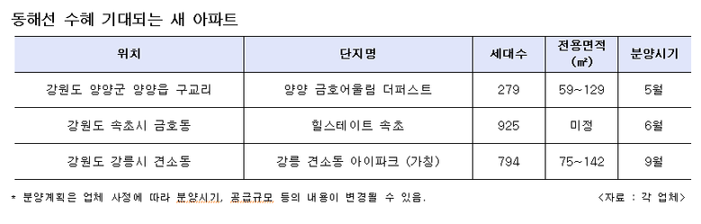 동해북부선 수혜가 기대되는 지역 중 가장 눈길을 끄는 강원도 양양군에서는 ‘양양 금호어울림 더퍼스트’가 5월 중 분양에 나설 예정이다. 강원도 양양군 양양읍 구교리에 위치하며, 전용 59~129㎡ 총 279세대 규모로 조성된다. 한국자산신탁이 시행을, 금호건설이 시공을 담당한다. 이 단지에서 직선거리 약 1km 부근에는 동해북부선 양양역(예정)이 신규 개통될 예정이다. 이 가운데 양양역(예정)은 양양읍 송암리 일대에 조성될 예정으로 양양종합버스터미널과 인접해 향후 교통환경이 더욱 개선될 전망이다. 또 이 일대에는 양양경찰서가 올해 착공 예정으로 기대감을 높이고 있다. 이와 함께 서울~양양 고속도로가 인접해 차량을 통해 서울까지 약 90분이면 이동할 수 있다. 여기에 양양 남대천과 설악산 국립공원 등을 중심으로 친자연적인 주거환경을 자랑한다. 양양초와 양양중, 양양고 등 모든 학군이 가까운 학세권 입지도 주목된다.