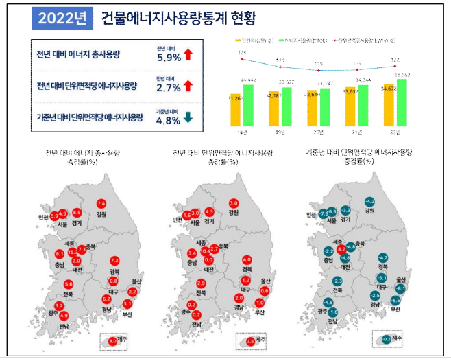 다만, 2030 국가 온실가스 감축 및 2050 탄소중립 달성 목표의 기준 연도인 2018년과 비교하면 단위면적당 사용량은 4.8% 감소했다.