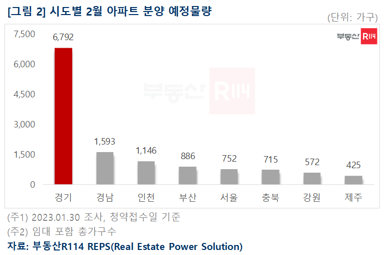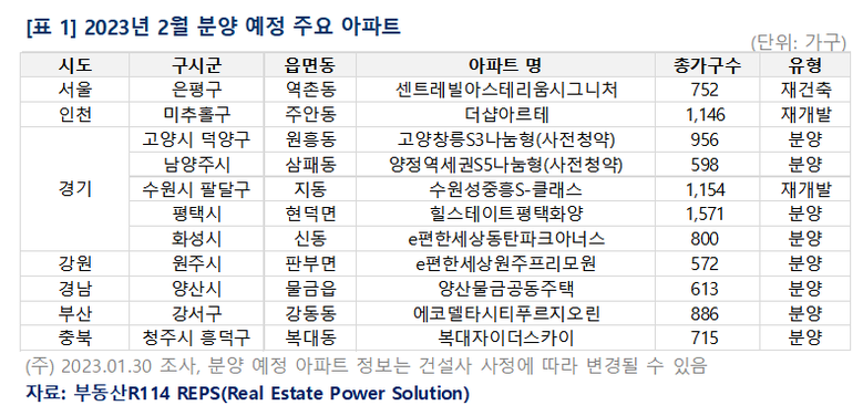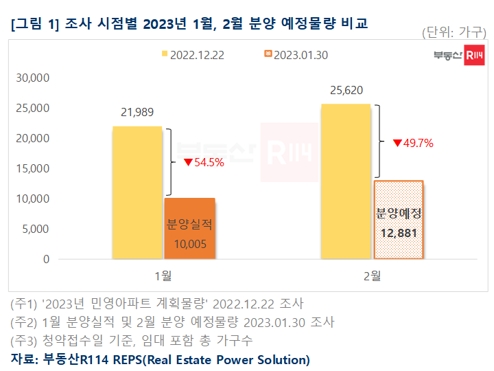부동산R114에 따르면 2월 분양 예정 아파트는 전국 20곳, 총 1만2,881가구(임대 포함)로 조사됐다. 지난해 말 ‘2023년 민영아파트 계획물량’ 조사 당시 2만5,620가구가 공급 예정이었으나, 서울 재개발 단지와 지방 대단지 아파트 위주로 분양이 미뤄지며 당초 예상보다 1만2,739가구가 줄었다.