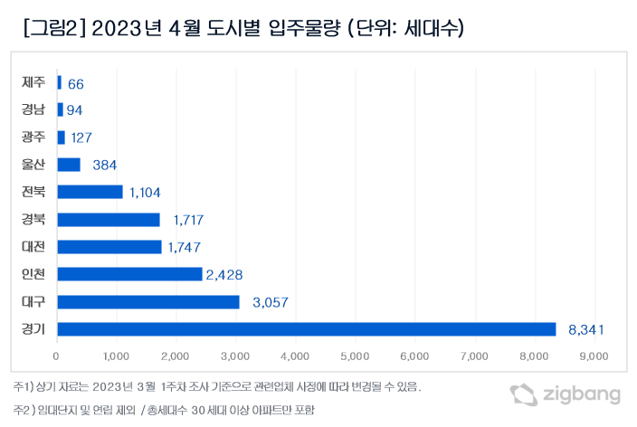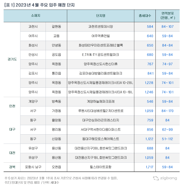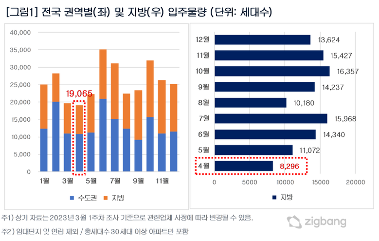 올해 4월은 연내 가장 적은 입주물량이 입주한다. ㈜직방이 조사한 바에 따르면 4월 입주물량은 총 1만 9,065세대로 올해 월별 입주물량 중 가장 적다. 전년동기 입주물량보다는 10% 가량 많지만 전월보다는 3% 정도 적은 물량이다.