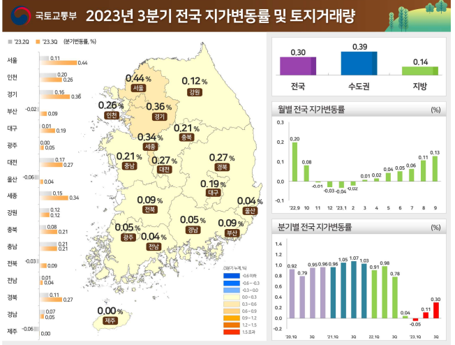 국토교통부는 한국부동산원과 이런 내용을 담은 '2023년 3분기 지가 변동률 및 토지거래량'을 24일 발표했다.