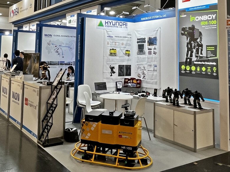 한국로봇산업진흥원이 마련한 한국 로봇 공동관 부스에 전시되는 AI 미장로봇은 바닥 미장 작업의 무인화를 목적으로 개발된 스마트 건설 장비다. 타설된 콘크리트 바닥면을 3D 스캐너로 정밀 측량하고, 평활도가 기준치에서 벗어나는 부분을 4개의 미장날이 장착된 2개의 모터를 회전시켜 미장 작업한다.
