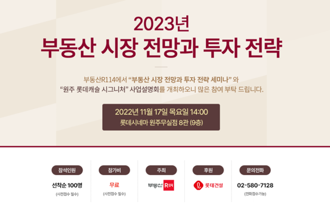 부동산R114는 오는 17일 롯데시네마 원주무실점에서 '2023년 부동산 시장 전망과 투자 전략'을 주제로 세미나를 개최한다.