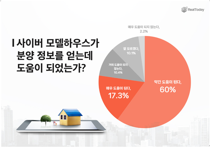 실제로 사이버 모델하우스 영상이 분양 정보 취득에 도움이 되는 가라는 질문에 77.3%의 수요자들은 도움이 된다고 응답했다. 반면 도움이 되지 않는다는 부정적인 답변은 12.6%, 잘 모르겠다는 답변은 10.1%였다.