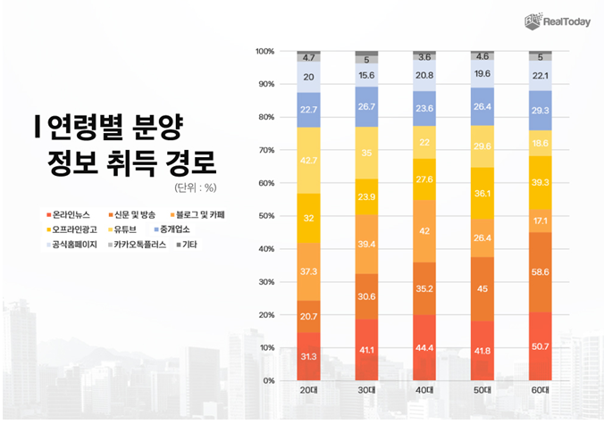 세부적으로 연령별 정보 습득 경로 분석을 확인한 결과, 20대는 ‘유튜브‘(42.7%)를 통해 가장 많은 분양 정보를 취득하고, 30대와 40대는 온라인 뉴스를 통해 정보를 얻고 있었다. 반면, 50대와 60대 이상은 주로 ‘신문 및 방송’을 통해 분양 정보를 접한다고 답했다.