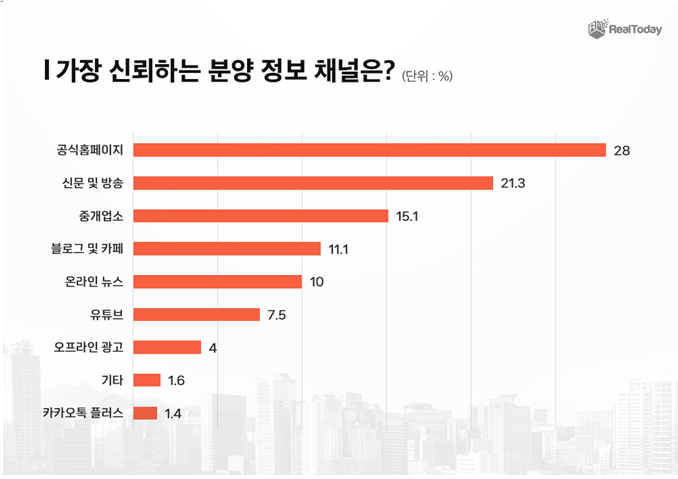 기술 발전으로 새로운 정보 플랫폼과 채널이 늘어나면서 정보를 습득할 수 있는 경로가 다양해지고 있지만 분양시장을 대하는 수요자들은 뉴스 매체를 통해 가장 많은 분양 정보를 습득하고 있는 것으로 나타났다. 특히 31.3%의 수요자들이 가장 신뢰할 수 있는 매체로 뉴스 매체(신문 및 방송,온라인 뉴스)를 선택하기도 했다.