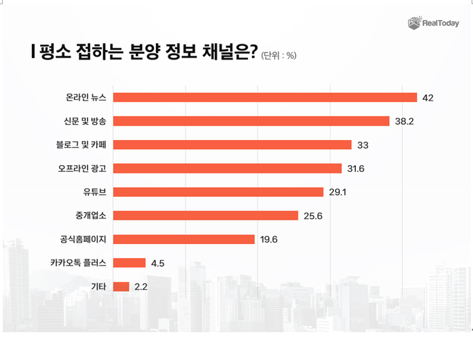 실제로 아파트와 오피스텔 분양 정보를 어느 채널을 통해 얻는가에 대한 질문(중복응답)에 온라인 뉴스(42%), 신문 및 방송(38.2%)가 선택되면서 뉴스 매체(온라인 뉴스,신문 및 방송)를 선택한 응답자(80.2%)가 가장 많았다. 다음으로 ‘블로그 및 카페‘(33%), ‘오프라인광고(현수막, 지하철광고 등)’(31.6%), ‘유튜브’(29.1%), ‘중개업소’(25.6%), ‘공식홈페이지’(19.6%), ‘카카오톡플러스’(4.5%) 순으로 나타났다. 그 외 기타(2.2%)로는 ‘분양 어플’과 ‘지인’을 통해 정보를 얻는다는 답변도 있었다.