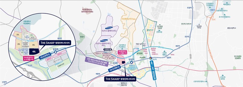 단지가 들어서는 아산탕정지구 도시개발구역은 갈산리,매곡리 일원, 53만 6,900여㎡ 부지에 약 4,300여 가구 규모의 주거타운을 조성하고 학교, 녹지, 공공청사 등 입주민들을 위한 도시기반시설들을 건립할 예정이다. 특히 아산에서 주거선호도가 높은 탕정 택지지구와 연결되며, 탕정역과 인접한 입지여건을 갖추고 있는 만큼 향후 아산·천안을 대표할 주거중심지로 주목받고 있다.