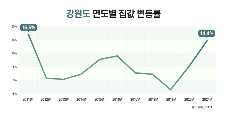 연도별로 보면 강원도 집값은 2011년 16.5%의 역대 최고 상승률을 기록했다. 이후 2019년을 제외하고 2012년부터 2020년까지 9년 동안 0%대에서 9%대의 크고 작은 상승률을 유지했다. 지난해 기록한 14.4%는 역대 두 번째로 높은 상승률이다.