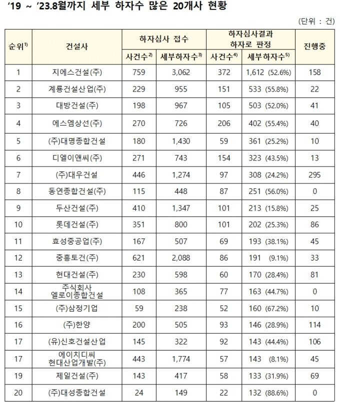 이밖에도 효성중공업(193건), 중흥토건(191건), 현대건설(170건), 엘로이종합건설(163건), 삼정기업(160건), 한양(146건), 신호건설산업(143건), HDC현대산업개발(143건), 제일건설(133건), 대성종합건설(132건) 등도 하자 판정이 많은 상위 20개 기업에 포함됐다.