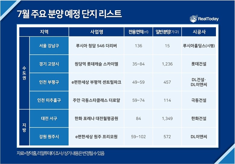 부동산 전문 리서치업체 리얼투데이의 조사에 따르면, 7월 전국에서는 총 65곳·4만7,076가구(사전청약·공공·신혼희망타운·임대 포함, 행복주택·오피스텔 제외)가 공급 예정으로 집계됐다.