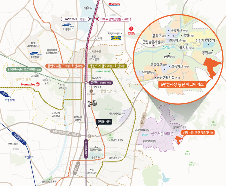 신주거문화타운은 동탄2신도시 내에서도 공원과 녹지 면적이 넓다. 특히 e편한세상 동탄파크아너스는 효제봉 자락에 위치해 있으며, 신리천과 신리제2저수지, 왕배산3호공원 등도 인접해 있다. 또 신주거문화타운 내 초·중·고교 부지도 계획돼 있어 안전한 통학도 가능하다.