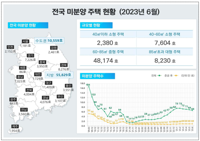 반면 공사가 끝난 뒤에도 분양되지 못해 악성 미분양으로 분류되는 '준공 후 미분양'은 9399호로 전월보다 5.7%(507호) 늘어난 것으로 집계됐다. 이는 2021년 4월(9044호) 이후 2년 3개월 만에 최고 수준이다.