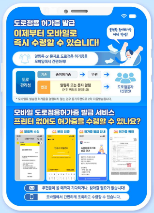모바일 도로점용허가증은 신청인이 소셜네트워크서비스(SNS) 알림톡이나, 문자 등으로 전송된 안내사항을 모바일 기기로 확인해 본인 인증을 거치면 발급받을 수 있다. 단순 조회뿐만 아니라 출력이나 다운로드도 가능하다.