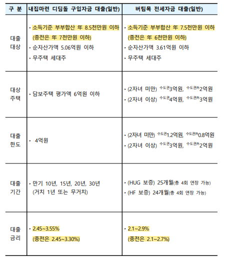 다만, 대출 시 주택 가격과 보증금 요건, 대출 한도 등은 변동이 없다. 구입자금 대출을 받으려면 주택가격이 6억원(담보주택 평가액) 이하여야 하고, 4억원 한도에서 대출받을 수 있다.