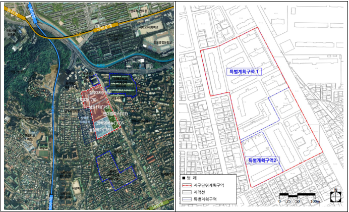 ▲이수아파트지구 위치도(왼쪽)와 지구단위계획구역. 사진=서울시 제공