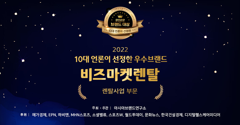 아시아브랜드연구소는 비즈마켓렌탈이 국내 10대 언론이 뽑는 '대한민국 브랜드대상'에서 '2022 렌탈사업부문' 우수 브랜드로 선정됐다고 27일 밝혔다.