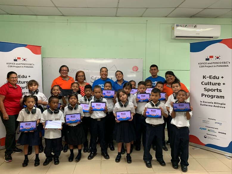 | ▲포스코이앤씨가 지난 11일부터 5일간 문화체육관광부 산하 한국국제문화교류진흥원과 함께 파나마 파나마시티 아라이한지역에 위치한 기예르모 안드레베 초등학교(Escuela Bilingüe Guillermo Andreve)에 디지털 학습기기 및 도서관 조성을 지원하고 40명의 교사 대상으로 교육연수를 진행했다.기예르모 안드레베 초등학생들이 디지털 학습프로그램을 받고 기념촬영을 하고 있다.<사진제공=포스코이앤씨> |