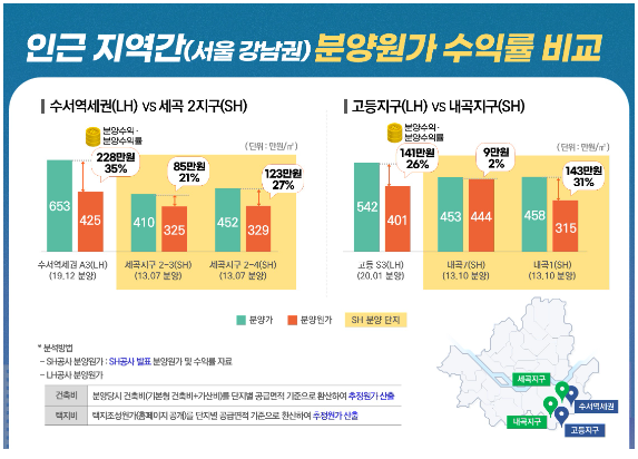 우선 비슷한 위치에서 LH가 분양한 수서역세권 A3블록 분양 수익률은 34.8%, SH공사가 분양한 세곡지구2-3단지는 20.7%로 LH의 수익률이 14.5%포인트 높은 것으로 나타났다. 1㎡당 분양수익도 수서역세권 A3블록이 228만 원, 세곡 2-3단지가 85만 원으로 LH가 143만 원 가량 높았다.