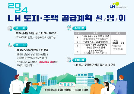 한국토지주택공사(LH)는 오는 26일 경기 성남시 소재 LH 경기남부지역본부 1층 대강당에서 '2024년 토지.주택 공급계획 설명회'를 개최한다고 23일 밝혔다.