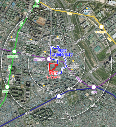 서울 영등포구 영등포동5가 30 일대 영등포1-11구역은 여의도·영등포 도심에 속한 곳으로, 이번 심의에서 신산업·일자리 중심지 육성을 지원하고 도심의 배후주거지로 직주근접 지원과 도심공동화를 막고자 해당 구역의 주거 비율을 현재 연면적의 50%에서 90%까지 확대하기로 했다.
