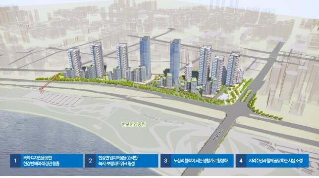 시는 '한강의 활력을 함께 누리는 수변 특화 단지'를 목표로 ▲특화 디자인을 통한 매력적 경관 창출 ▲한강변 특성을 고려한 녹지·보행로 형성 ▲생활가로 활성화 ▲공유 시설 조성 등 네 가지 계획 원칙을 실행해 나간다는 방침이다.