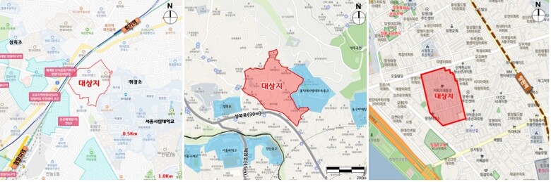 | ▲서울 동대문구 전농동 152-65일대(왼쪽부터), 성북구 성북동 3-39일대, 마포구 망원동 416-53일대 위치도. 사진=서울시 제공 |
