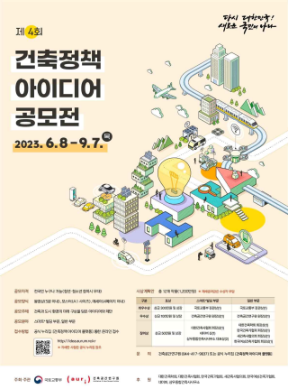 국토교통부는 국민 정책수요에 부응하는 새로운 건축정책 아이디어를 발굴하고, 국민들의 정책 참여 기회를 높이기 위해 오는 8일부터 9월7일까지 '제4회 건축정책 아이디어 공모전'을 연다고 5일 밝혔다.