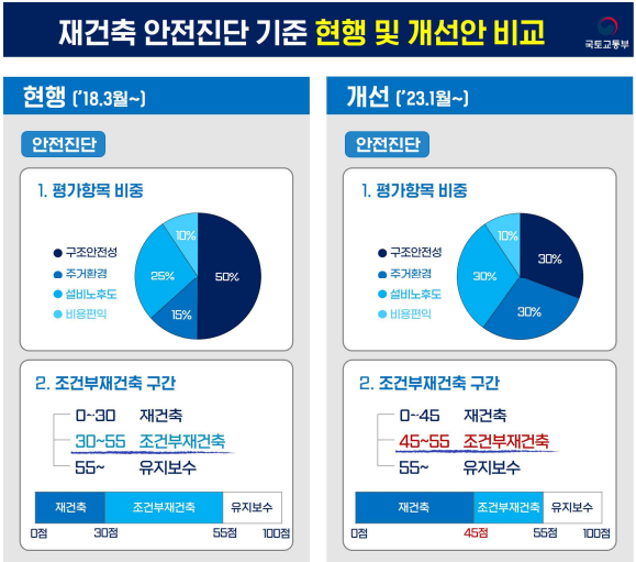 개선안은 재건축 진행에 차질을 야기해온 '조건부 재건축' 범위를 축소하고, 바로 재건축 추진이 가능한 '재건축' 허용 대상은 확대하는 내용도 담았다.